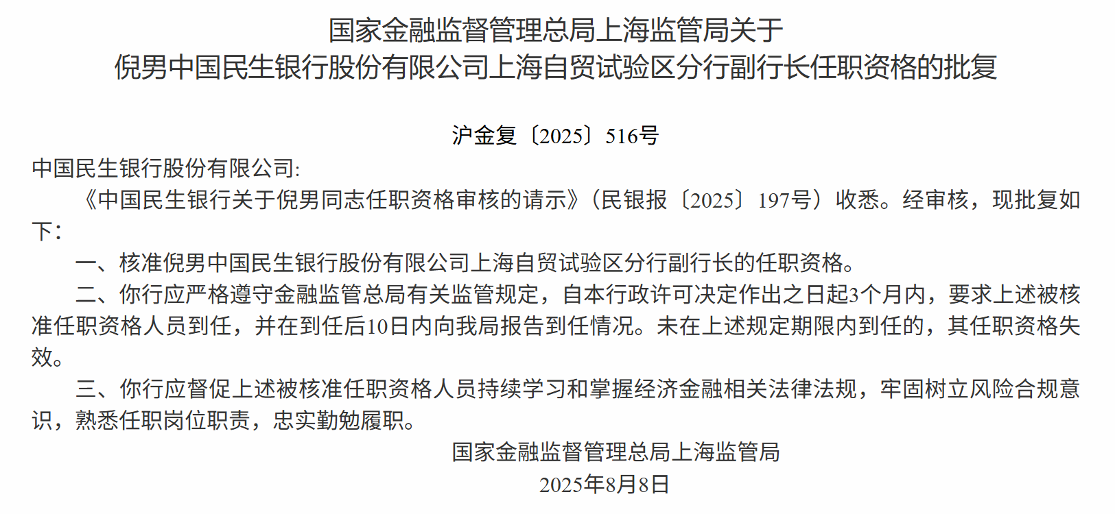 8月18日,国家金融监督政府上海监管局发表了对上海自由贸易飞行员副总裁副总裁Minsheng Bank Co,Ltd.的资格的回应,并批准了该副副副副副副副副副副副副副副副副副副副副副副副总统银行的合格公司副总统。